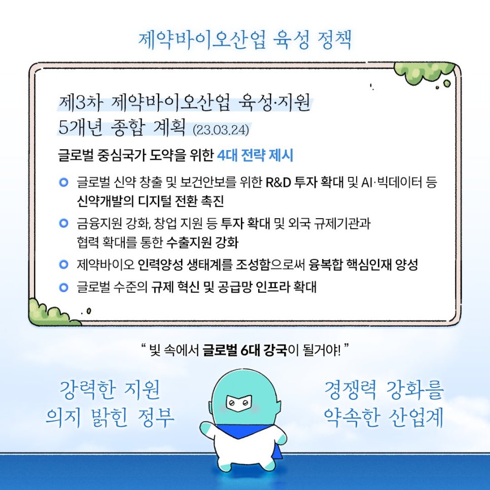 정부도 기세를 몰아서 국내 바이오 산업을 글로벌 시장에 안착시키기 위해 각종 지원을 아끼지 않고 있는데요. 지난 2023년에는 '글로벌 6대 제약강국'을 목표로 '제3차 제약바이오산업 육성·지원 5개년 종합계획'을 발표하기도 했습니다.