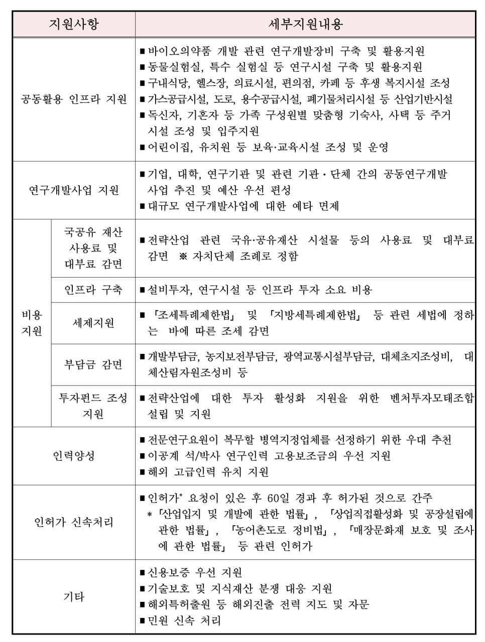 아래 표는 [강원 바이오 국가첨단전략산업 특화단지 조성 계획]에 수록된 '특화단지 지원 내용' 입니다. 참고하셔서 기업 및 공장 이전에 도움이 되기를 바랍니다.